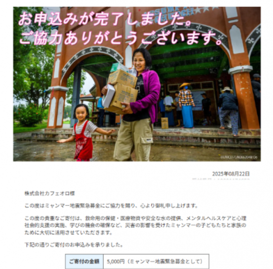 2025年8月22日に寄付第一弾として5000円を「公益財団法人日本ユニセフ協会/ミャンマー地震緊急募金」へ寄付いたしました。今後も支援を続けていきたいので、引き続きミャンマー地震復興支援コーヒーを販売してまいります。皆様のご支援を今後とも何卒よろしくお願い申し上げます。